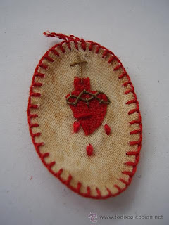 Si ir antes a combatir bajo las banderas del Rey, en la plenitud de los ejércitos de su católica majestad, era un negocio arriesgado, y de resultados muy inciertos, pues la muerte o la deformidad, ya fuese por la guerra o la enfermedad, siempre estaban presentes; cuando los bastos era el palo que pintaban y las derrotas eran numerosas y bien gravosas, el negocio se trocaba en pena de casi galeote, cuando no de muerte prácticamente cierta. De forma casi inmediata, a los soldados que partían en expedición, y abandonaban su hogar, la familia les comenzó o bien a entregar una pequeña chapita metálica con el Corazón de Jesús, o a coser con sus propias manos, unas pequeñas almohadillas de tela, con la imagen, y con leyendas bordadas relativas al culto, del estilo de “el Sagrado Corazón de Jesús está conmigo” o “yo reinaré sobre tus enemigos”. Mediante dos finas láminas de tela, se llevaba anudado al cuello, y por dentro del uniforme.